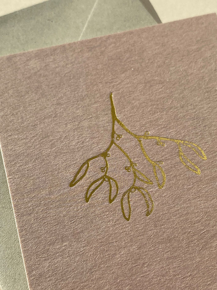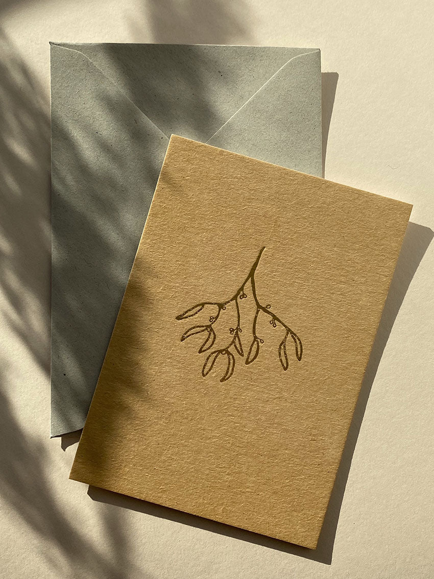 DIN A6 card made of Finnish cardboard with gold foil printed by hand.
