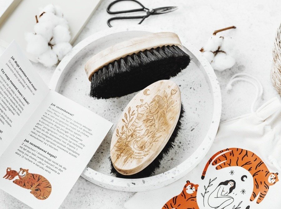 Beautiful, handmade dark horse hair wooden massage brushes, engraved with Tiger graphics by Monika Smetaniuk. The graphics captivated us so much they also ended up on the undyed cotton pouches into which we put the brushes and even more beautiful massage instructions, being an integral part of the set. The whole set looks lovely and encourages you to keep it forever as a utilitarian object of aesthetic value, giving pleasure to both body and soul. Perfect as a gift for someone else or simply, for yourself. We are super happy and super proud of these brushes because from a specific practical need arose a small work of art, beautifully framed and told.
